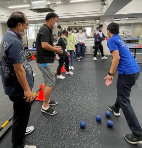 ボッチャでは厳しい判定員(学生)によるゲーム進行、
